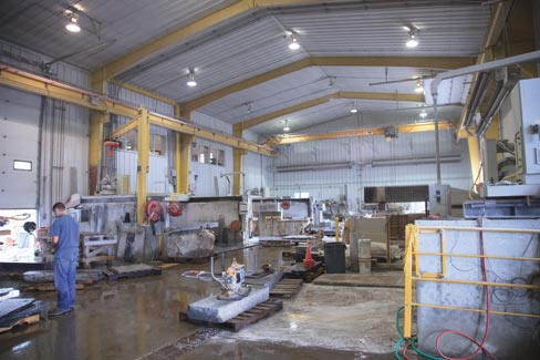 The all-under-one-roof shop houses a cache of G.M.M. block and bridge saws as well as a Park Industries Python II, while a Flow waterjet, G.M.M. lathe and Bidese Impianti contour wire saw serve to do shaping. A Thibaut surface polisher rounds out the arsenal. To facilitate movement of materials throughout the fast- paced shop, a 3-axis overhead crane spanning the entire work area makes optimal use of the 13,500 sq. ft. building, while two jib cranes satisfy the more intensely used areas. During the tour Jamie was eager to point out that they work closely with the Maine Department of Environmental Protection and employ ecologically friendly techniques during fabrication and quarrying, using closely monitored run-off ponds in the quarries and a huge, slightly “tricked out” Fraccaroli Balzan water filtration system throughout the shop. Clean environmental manufacturing and safety for the 32 employees are top priorities according to the Carle’s.