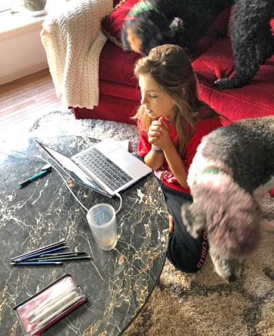 Taylor, my youngest daughter, doing her schoolwork via remote, with her current four-legged classroom peers, Buckley and Bailey supervising. |