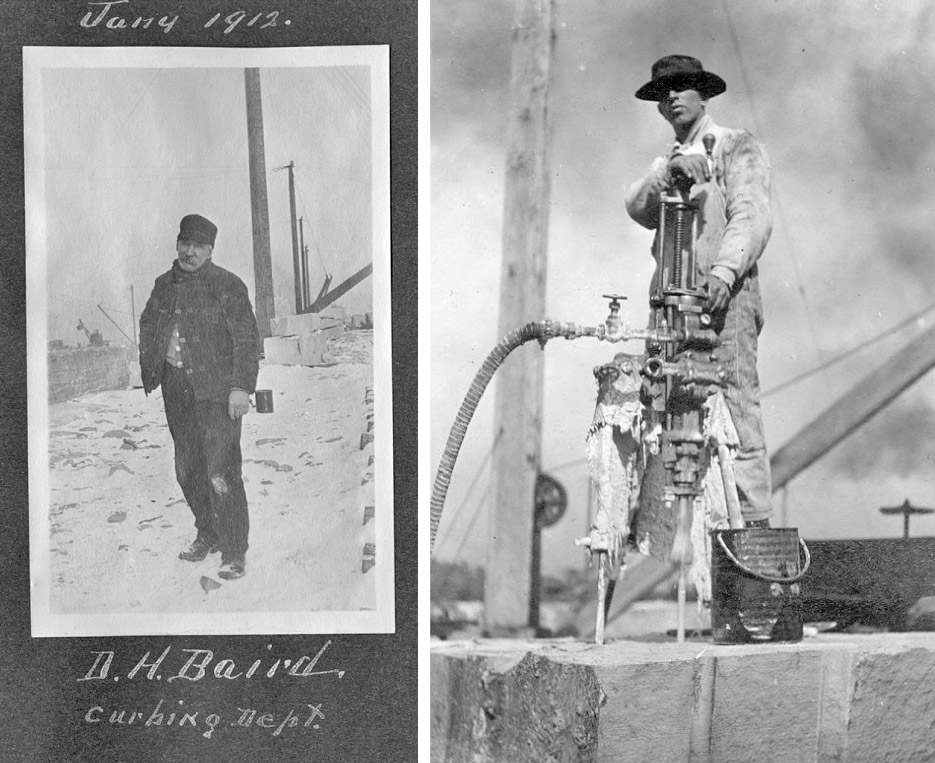 Above, left: Mr. B.H. Baird, Curbing Dept. Above, right: Quarryman test drilling, C 1930s |