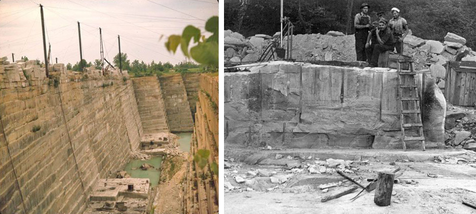 Above, left: Berea Quarry, Before Closure in 1939 Above, right: Drilling and splitting blocks from a quarry ledge. |