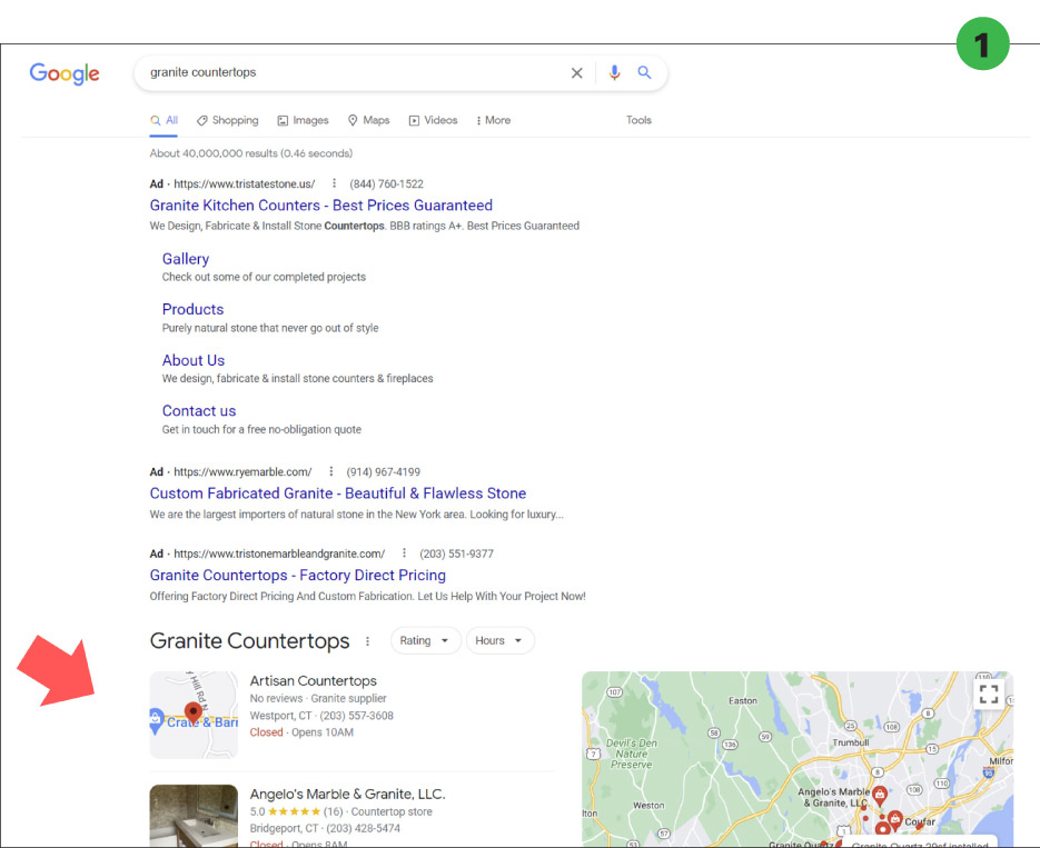 Google maps (currently called Google Business profile) is a MASSIVE opportunity to get more countertop jobs. When people search in Google for “granite countertops” or any of the other terms that are popular in the industry, they will see ads at the top, the maps section and then the organic section as shown in sample 1.