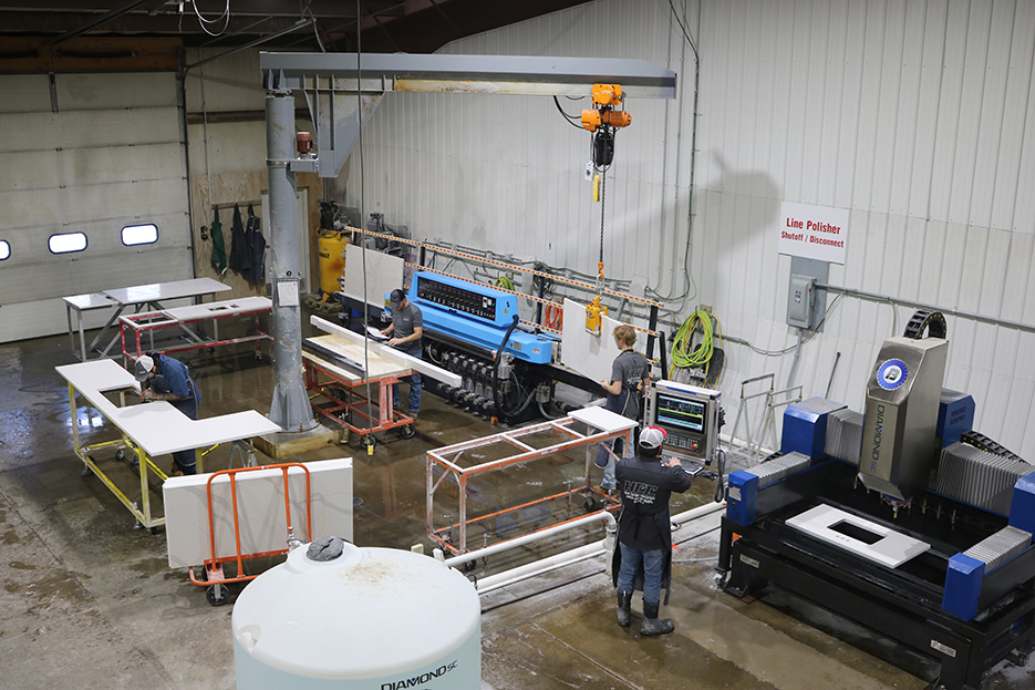 The Heiar shop features Machine  Tech Enterprise equipment, including an MTE CNC machine designed to fabricate sink cutouts, an MTE Diamond5 CNC bridge saw, and MTE line polisher and water system.